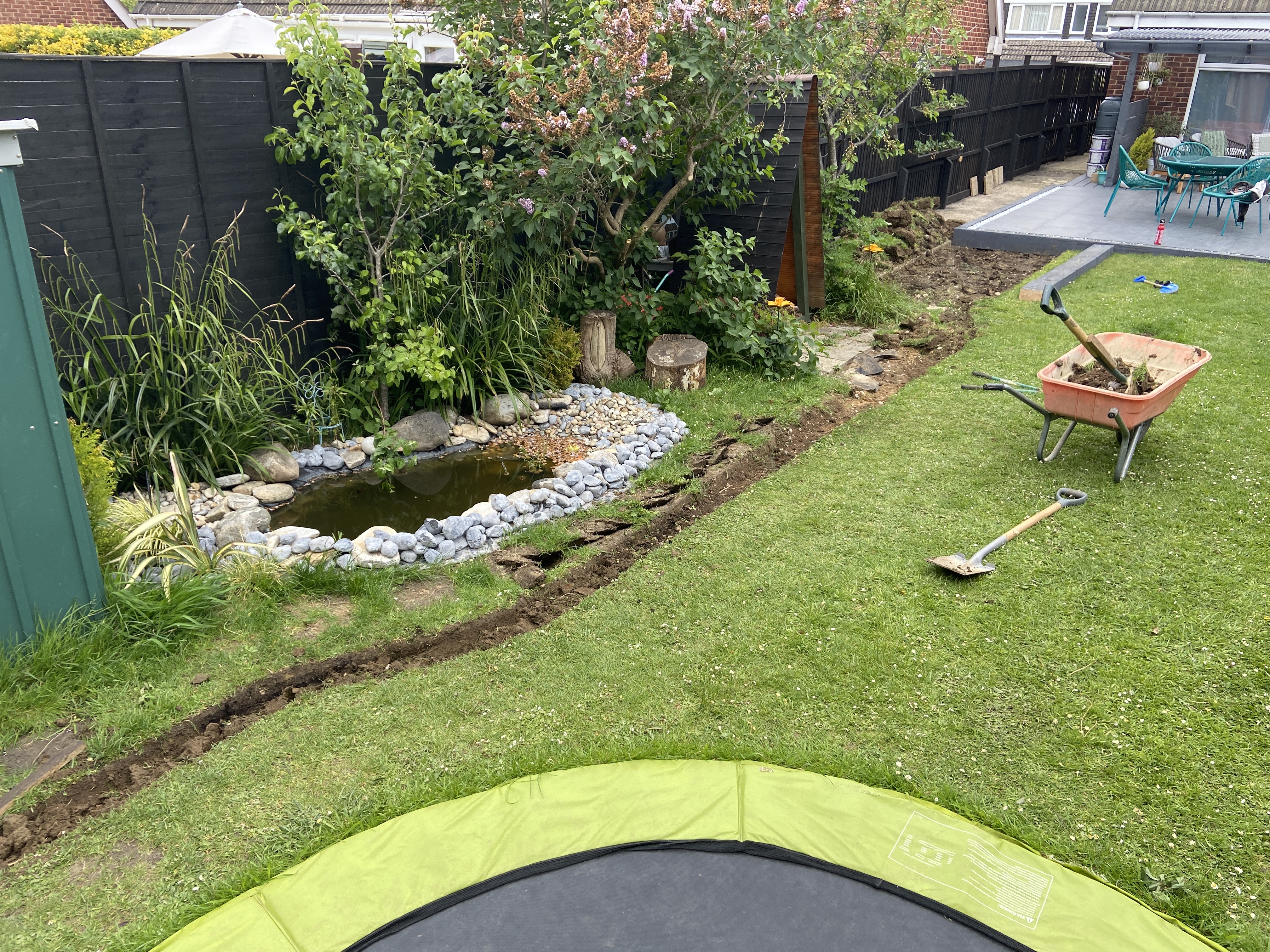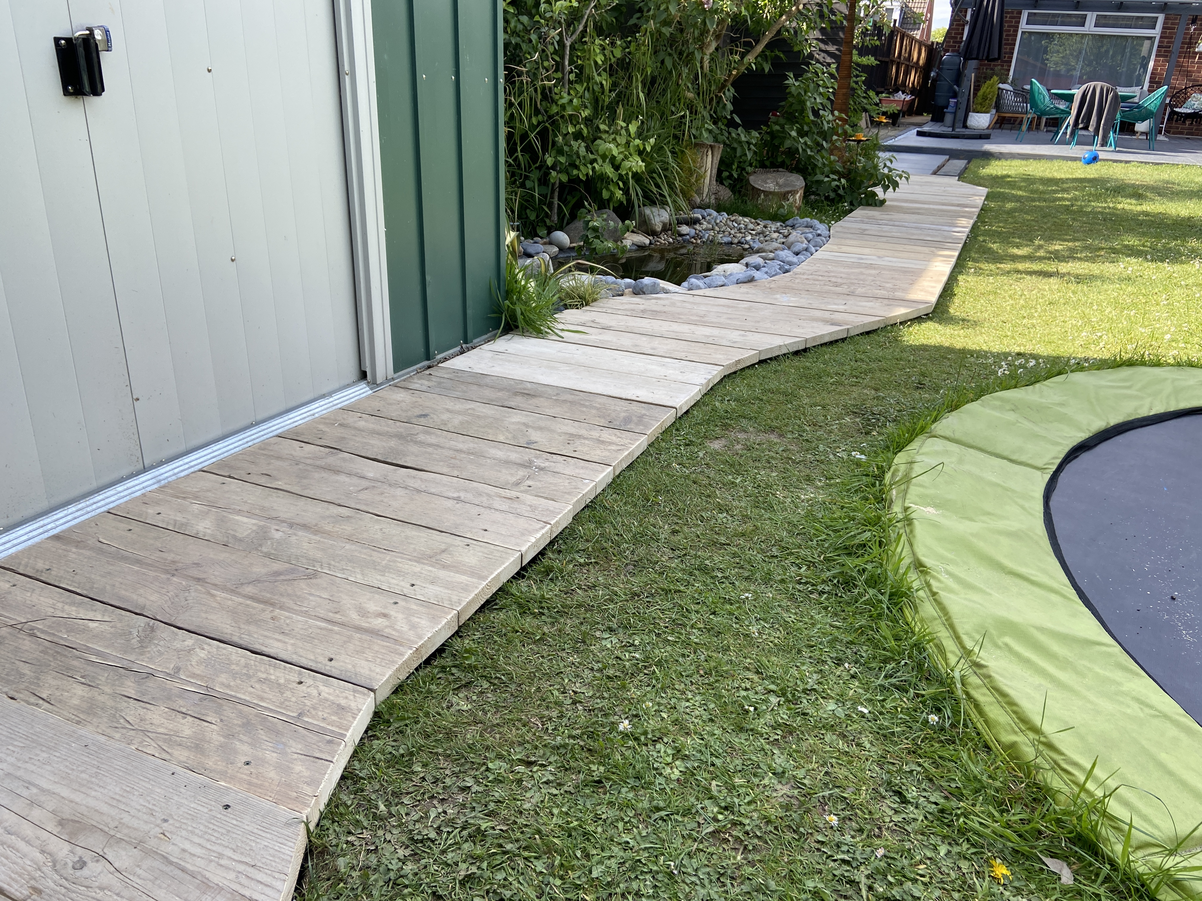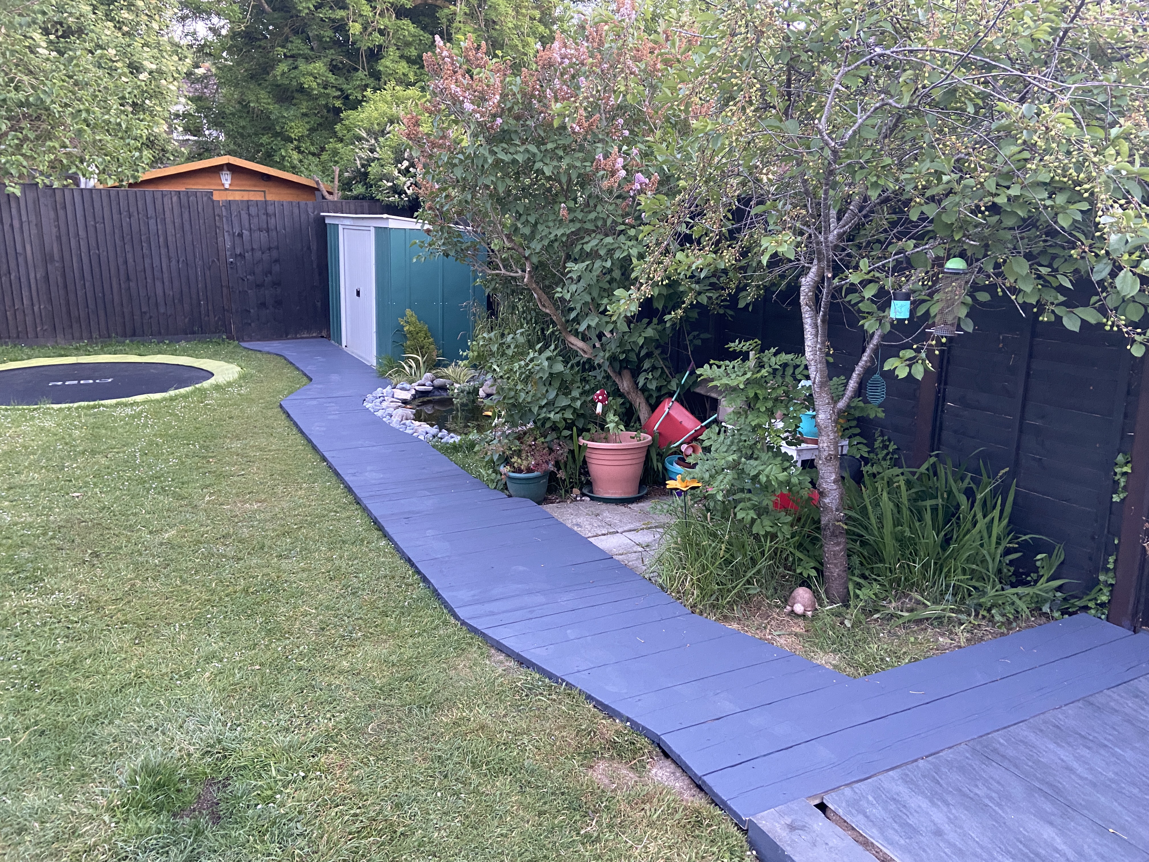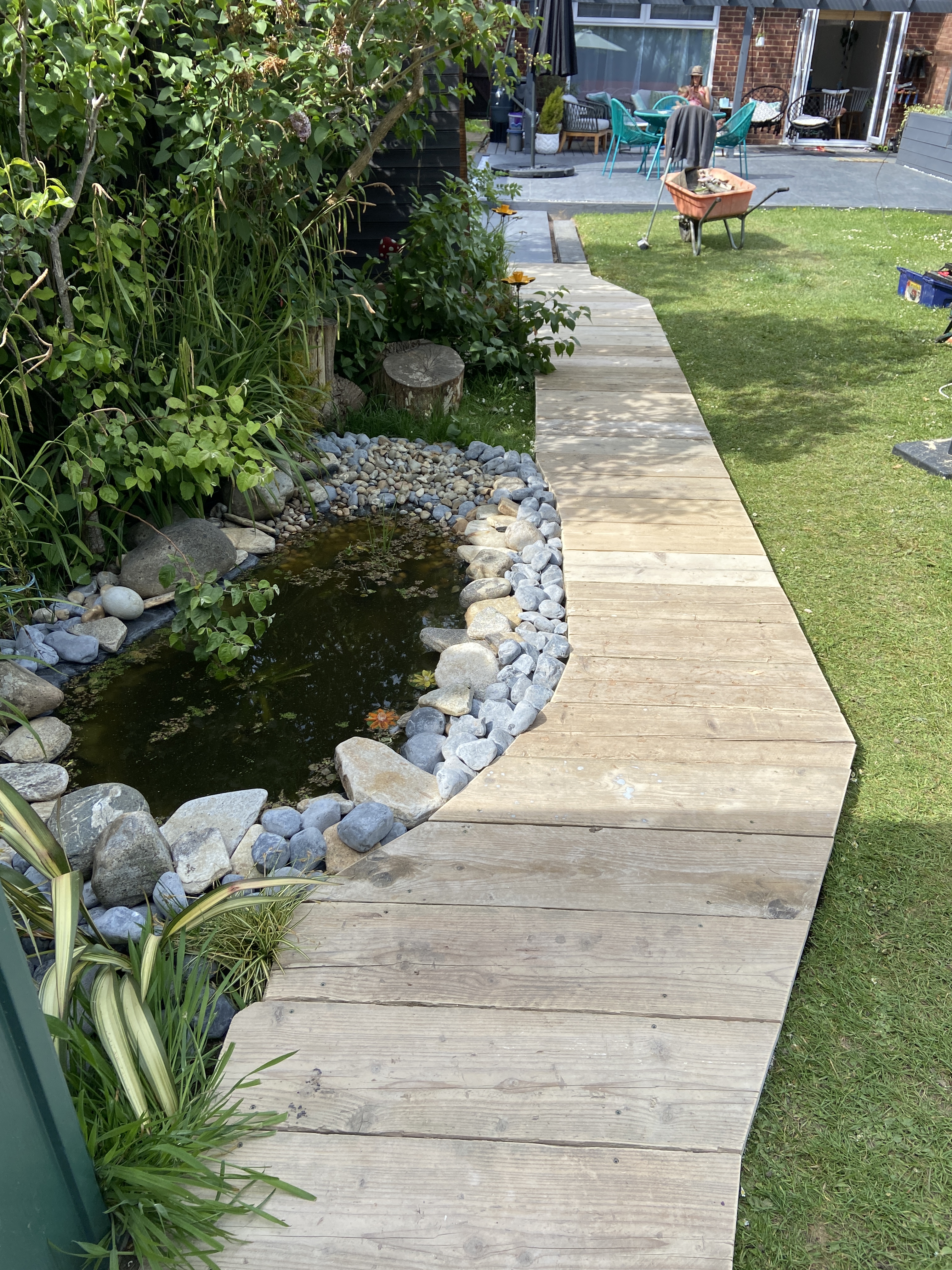 Lastly we decided with the boardwalk because we agreed it would look great around the pond and we could paint it to match the two decking areas I had also recently completed.